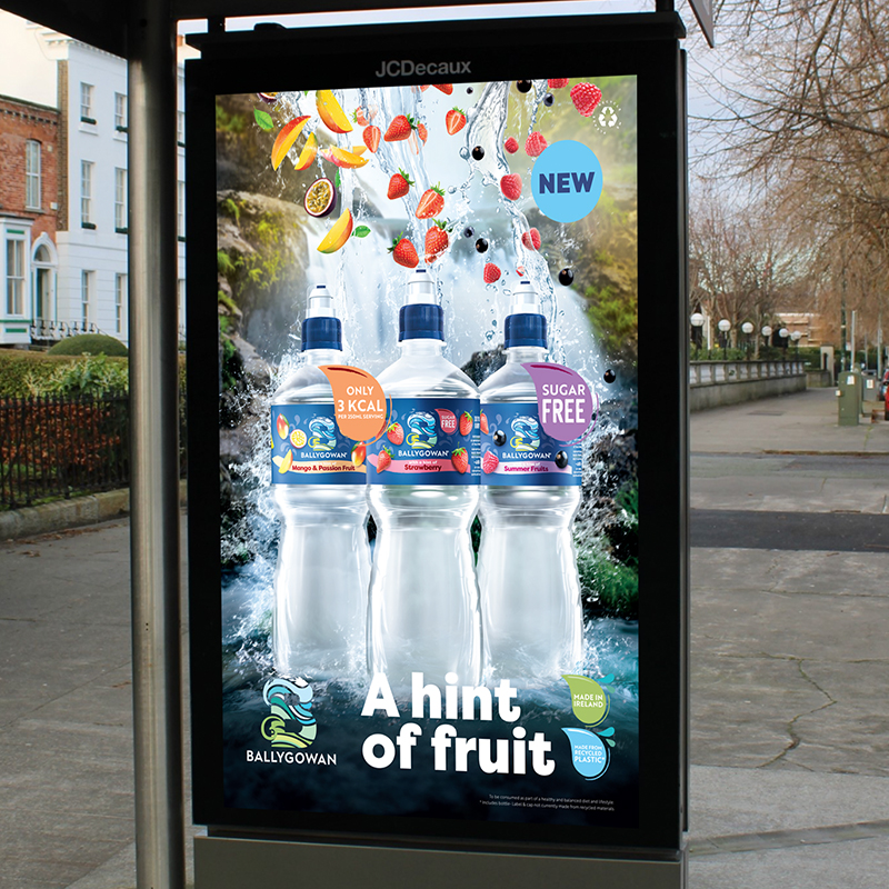 Tasked with creating a key visual for the launch of a new water drink for the client Ballygowan, the aim was to bring fruit in to the Irish landscape in keeping with the heritage and 750 years of purity of the water source whilst elevating the brand to a new refreshingly fruity offering to their ‘Bottled Wild’ range. The OOH campaign targeted the on the go lunch time rush and became the fastest selling product within the bottle water range.